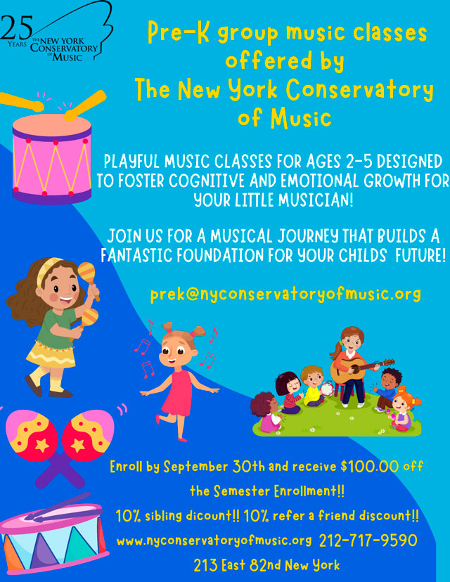 Starting Fall 2024, the New York Conservatory of Music is thrilled to open our PreK Division, designed especially for children aged 2-5. Our sessions take place in a spacious studio at 213 E 82nd Street, creating an ideal setting for young learners to discover music through colors, movement, rhythm, and a variety of musical instruments.